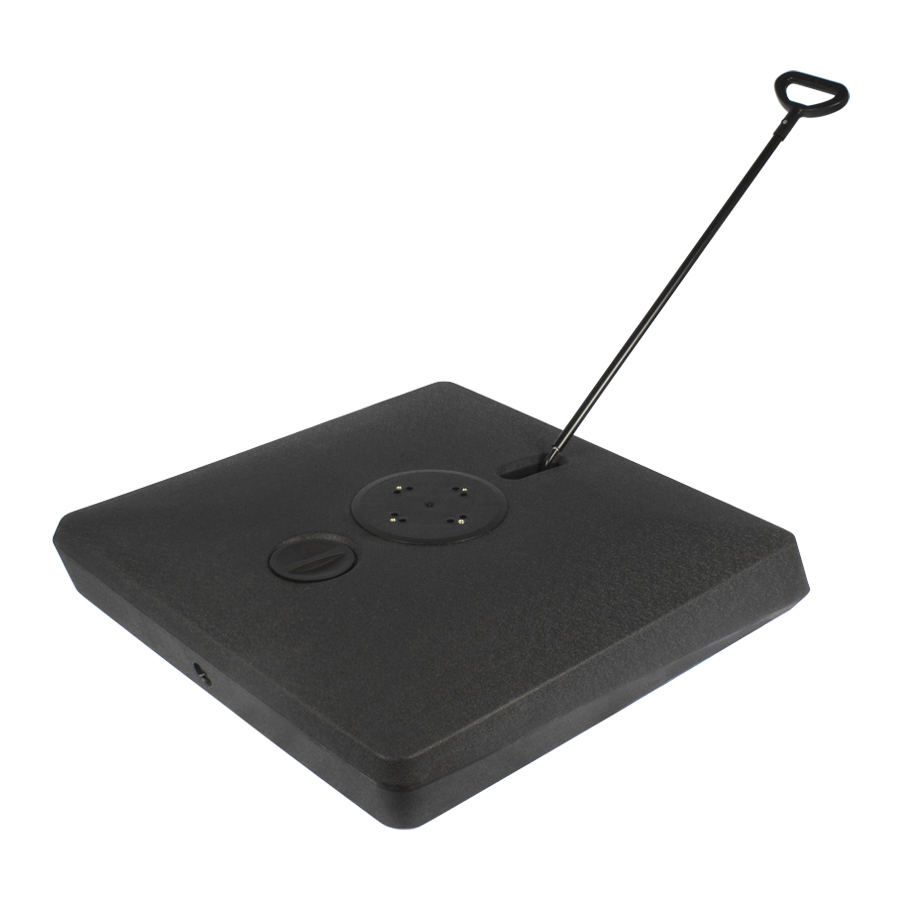 Base cuadrada de plástico rígido, rellenable (con agua, arena o piedrecilla, para darle mayor peso), con una capacidad total de 140kg o 140L. Viene con 4 ruedas sobre estructura de Acero y manilla tiradora retráctil, para fácil traslado y movimiento del quitasol.