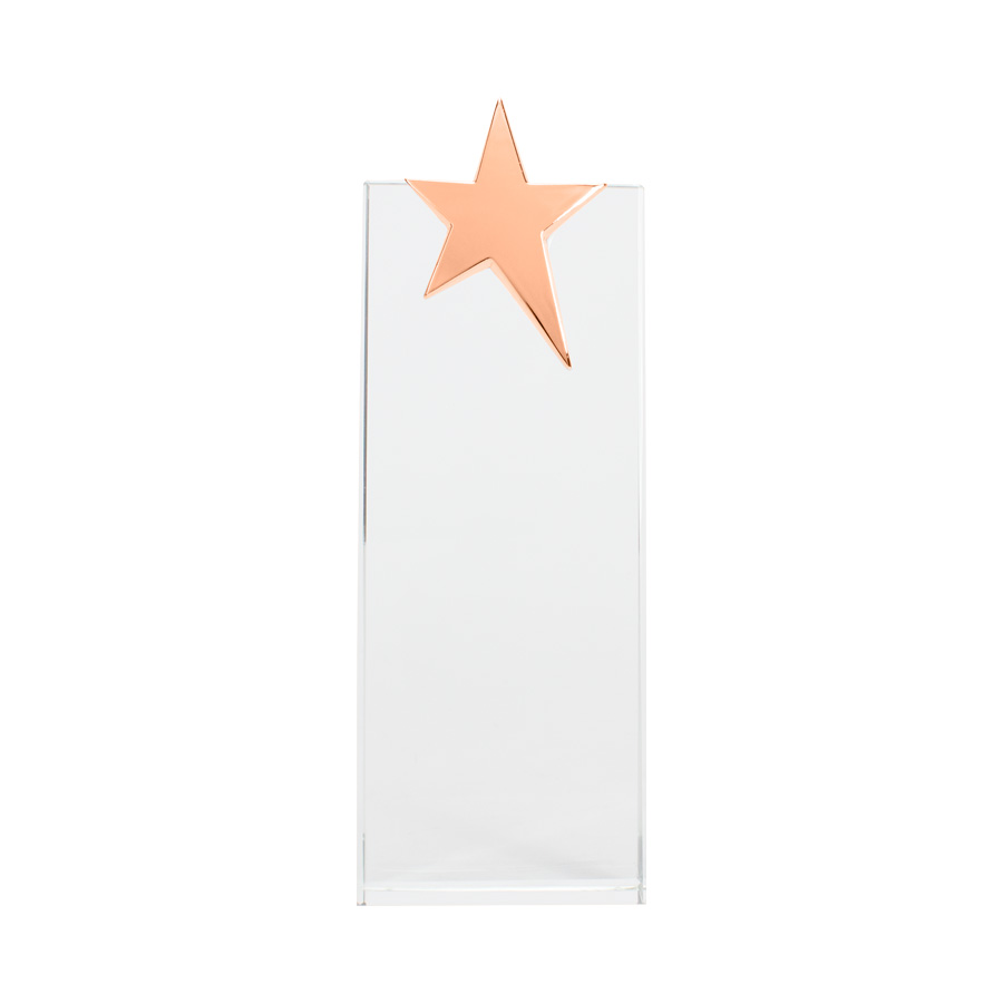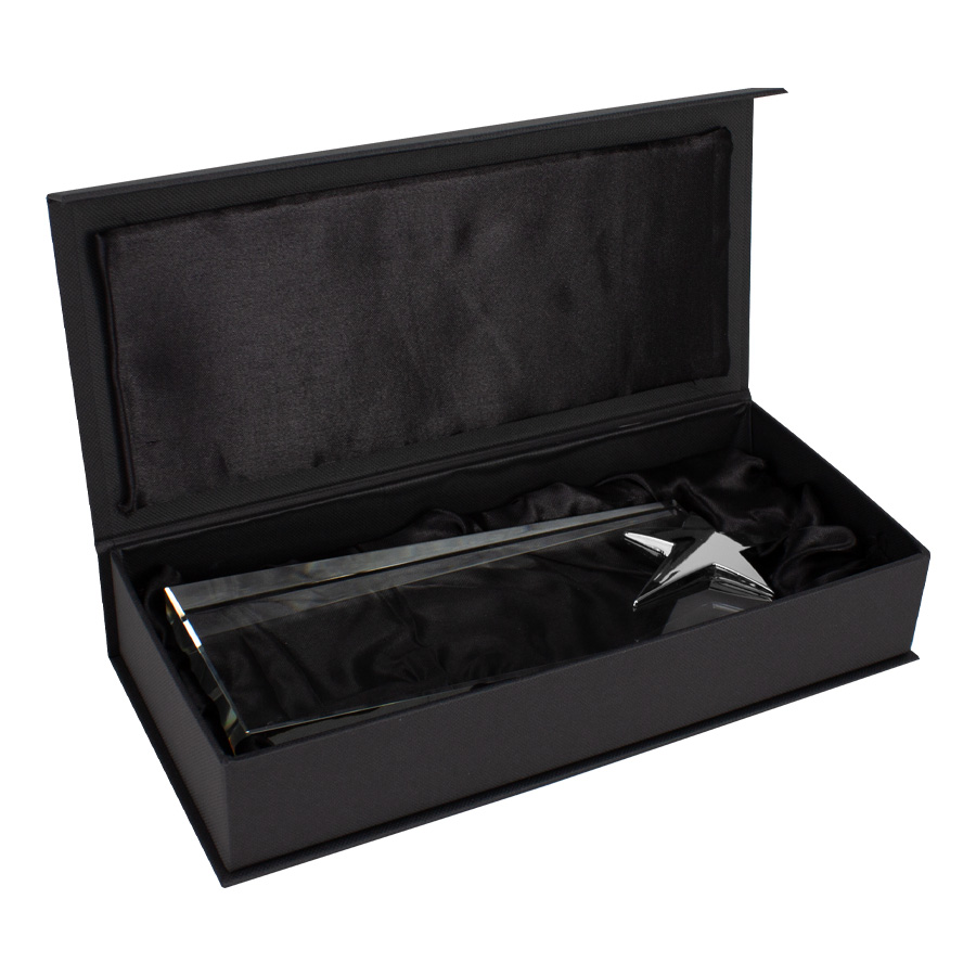 Elegante Trofeo Galvano de Cristal modelo “Ledecky”, con estrella de acero inoxidable de color metalizado en su parte superior. Presentación en caja de cartón forrado negro con cierre imantado, interior acolchado de espuma y tela poliéster satinado negro, con troquel.